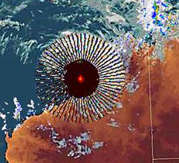L’image ci-dessus montre un anneau large bande couvrant plusieurs centaines de miles à travers le sud-ouest de l’Australie avec un petit point (probablement des nuages) – juste à droite du centre.